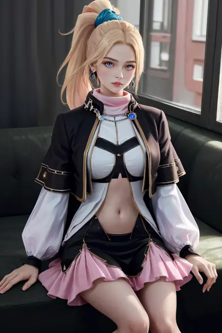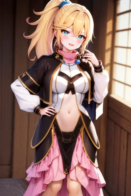 기본 복장: 분홍색 터틀넥, 검은색 캐프렛, 흰색 셔츠, 보석, 흰색 소매, 긴 소매, 배꼽 노출, 검은색 치마, 분홍색 프릴