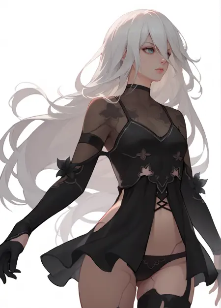 niera2rein, 白发, 长发, 发丝遮眼, 黑色连衣裙, 透明, 黑色手套, 黑色内裤