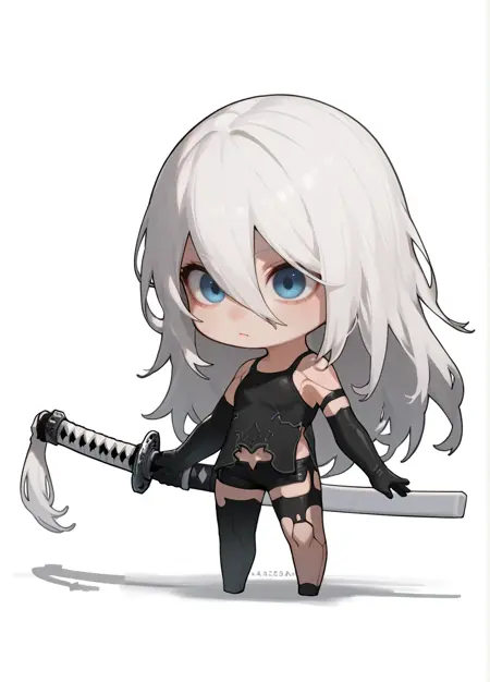 niera2def, 1girl, solo, 白发, 长发, 发丝遮眼, 无袖上衣, 机械人接缝, 肘部手套, 黑色短裤