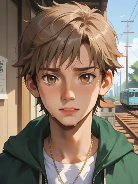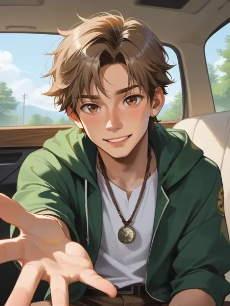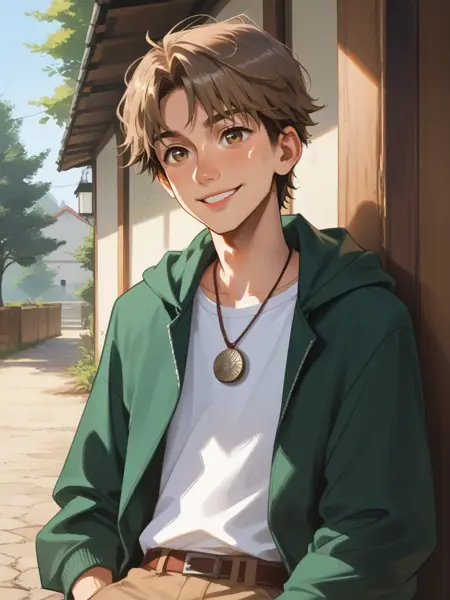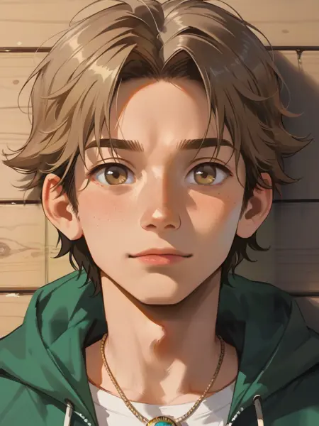 1boy, Isko Skye Villaro, Skye Villaro, Round face with soft, light brown eyes, freckles on nose, wavy chestnut-brown hair, green eyes, green hooded jacket, open green jacket with white shirt, white shirt, wearing wood amulet , wearing brown pants, cowboy shot, midriff
