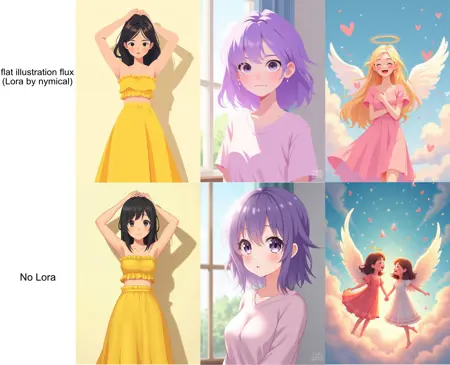 이 LoRA는 2D 평면 컬러 일러스트를 생성하는 데 도움이 됩니다.