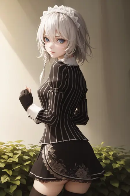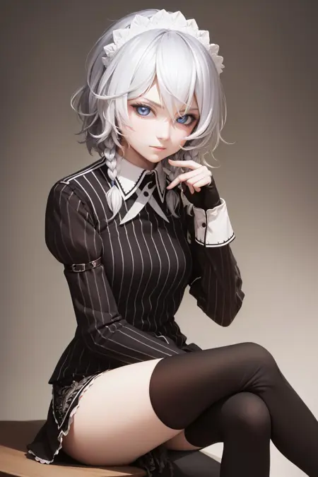 Default Outfit: maid headdress, maid, striped, thighhighs, fingerless gloves