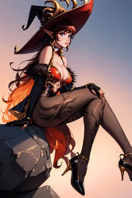 Add "witch hat, cleavage, fur trim, leotard, pantyhose, elbow gloves, high heels" for her typical look.