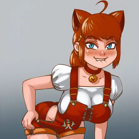 orange overalls, short shirt, puffy short sleeves, choker, bare upper hips, hairpin, thighhighs, boots