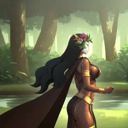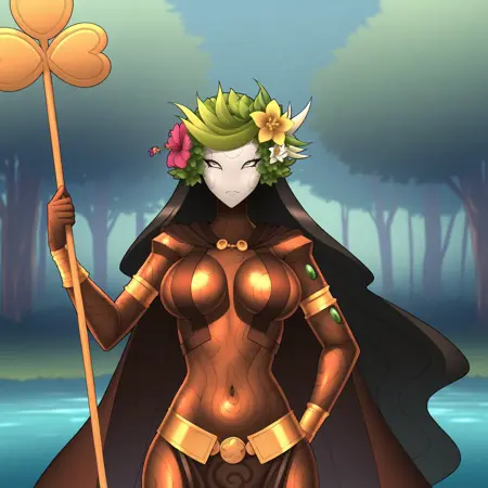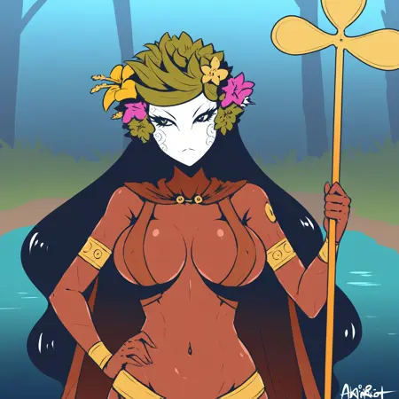 danusmt, long black hair, large breasts, hair ornament, navel, jewelry, green eyes, green hair, hair flower, cape, bracelet, colored skin, bronze skin, monster girl,loincloth, no nose