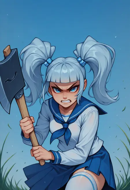 트리거 + 외모: rkn-chan, 긴 머리, 파란 머리, 곧은 앞머리, 쌍꼬리, 큐브 모양 머리 장식, 파란 눈