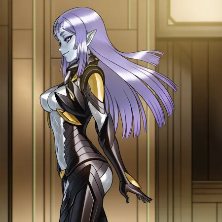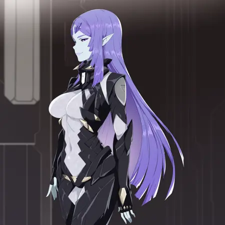 etfillus,colored skin,white skin,pointy ears,purple eyes,long purple hair,black armor,see-through bodysuit,white bodysuit,navel,thigh cutout || ass cutout