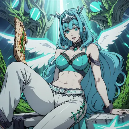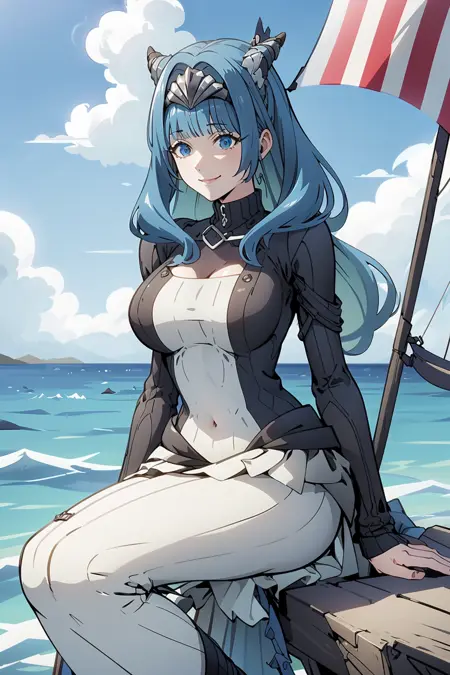Appearance: Blunt bangs, Double bun, Hair bun, Adult, Blue eyes, Blue hair, Very long hair, 1girl, mature female, large breast, lips, horns