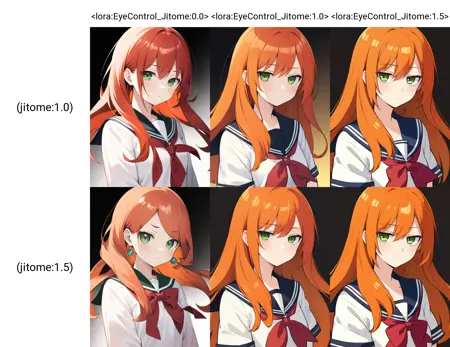 모델에 따라 0.8-1.5의 가중치 범위가 적절합니다. 고개를 들고 바라보려면 expressionless 또는 unamused를 사용하세요. 눈에 더 평평한 음영을 주려면 empty eyes를 사용하세요. grin 또는 기쁨을 나타내는 표현은 LoRA에 더 높은 가중치가 필요합니다.