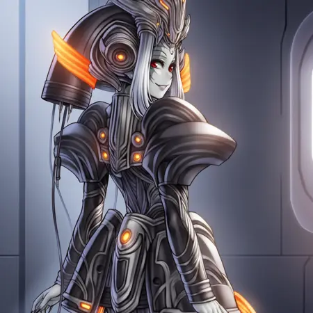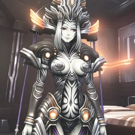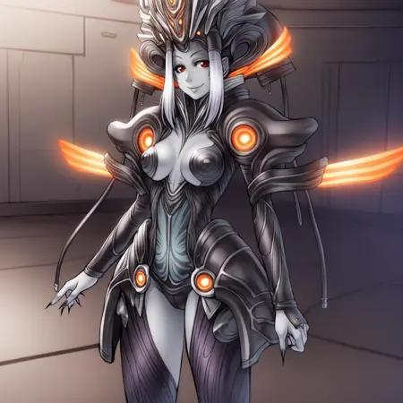 vanea, colored skin, , high heel boots, red eyes, sharp nails, shoulder armor