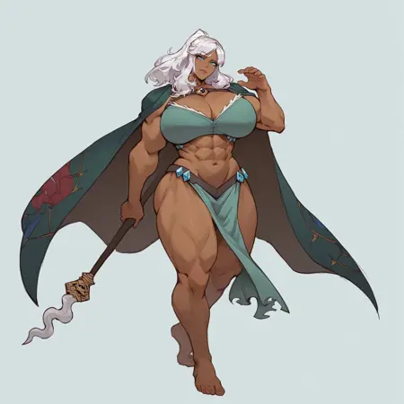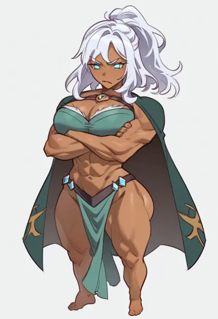 white hair, tan skin, green eyes, ponytail, blunt bangs, 1girl, muscular female, muscular, solo, dark skin, dark-skinned female, abs, huge breasts, massive breasts size, wide hips, large ass, white hair, barefoot, blue eyes, long hair, large breasts, cape, navel,