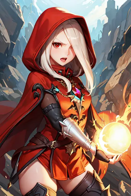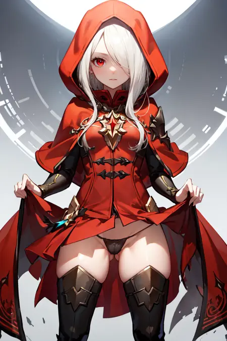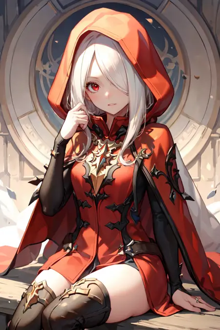 Outfit: red hooded cloak, red short dress, thigh boots, bridal gauntlet