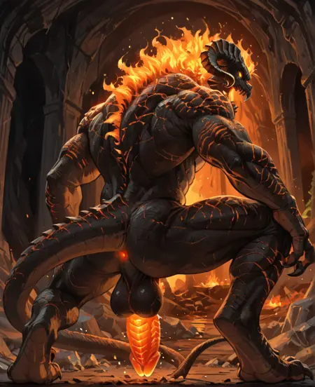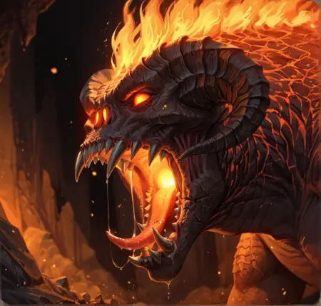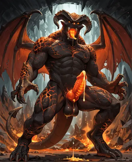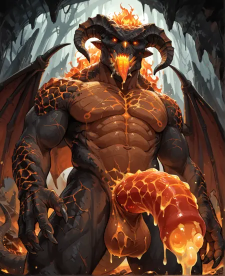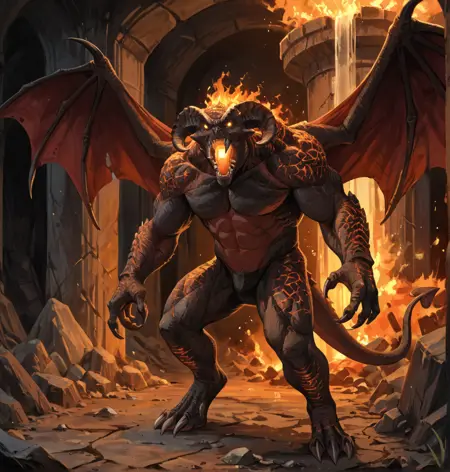 Tags: balr0g, demon, monster, creature, fire, brimstone, scales, cracked skin, muscular, pectorals, abs, glowing eyes, orange eyes, no pupils, horns, demon wings, wings, claws, tail, digitigrade, four fingers, two toes, glowing nostrils, glowing mouth, glowing tongue, sharp teeth, glowing