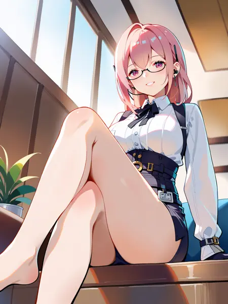 其默认游戏内女仆服装的附加提示:眼镜、黑色手套、高腰裙、高跟运动鞋、白色领衬衫、单肩甲、耳麦、束缚带、颈带