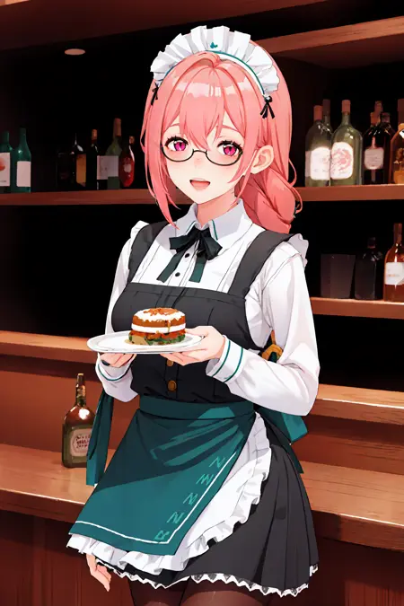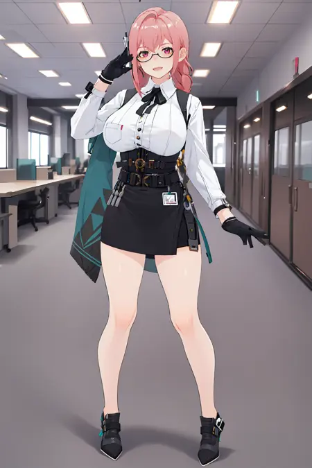 Additional prompts for her default in-game maid costume: glasses, black gloves, high-waist skirt, high heel sneakers, white collared shirt, single pauldron, earpiece, harness, neck ribbon