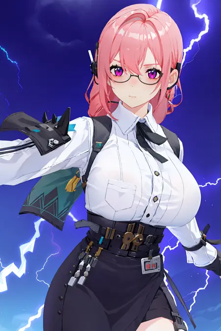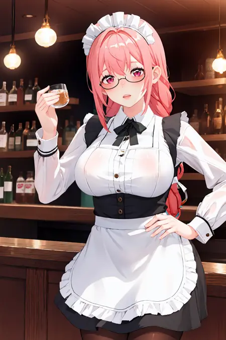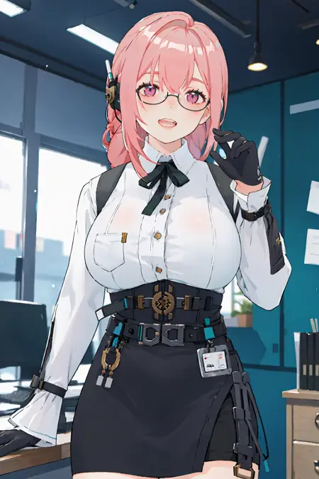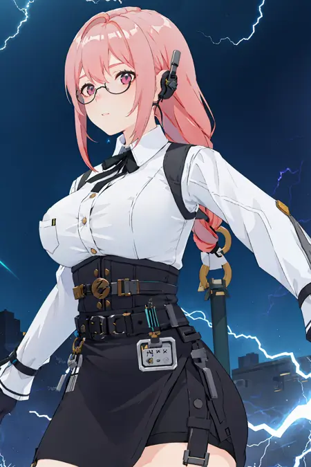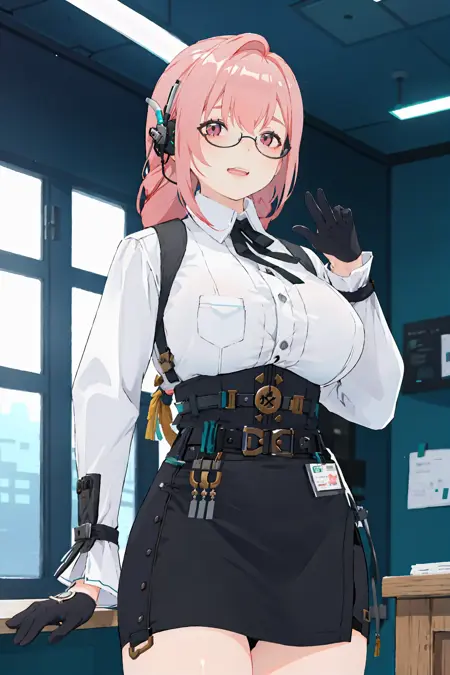 彼女のデフォルトのゲーム内メイド衣装用の追加プロンプト:眼鏡、黒手袋、ハイウエストスカート、ハイヒールスニーカー、白シャツ、片肩パウルドロン、イヤーピース、ハーネス、ネックリボン