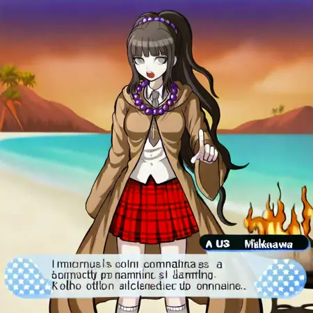 『ダンガンロンパSのGUI』:これはあまりうまくいきませんが、試すには以下のようにしてください。「The image uses danganronpa S GUI style with the danganronpa sprite style. A speech bubble is in the bottom of the image and it says "This is test text!" The speech bubble is in front of Mikako Kurokawa. There's a box with a blue background with white stars, and a grey arrow pointing right, beside the speech bubble. The text in the box says "Mikako Kurokawa" and it is next to the speech bubble.」