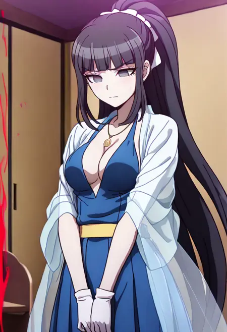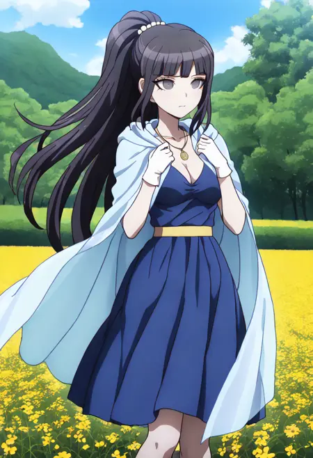 フォーマルドレス:「美香子はダンガンロンパアナザーのドレスを着ている。濃い青のドレスで、深いVネック。肩には短く、肩まで覆う透けたショールをかけている。手には長い白いイブニンググローブを着用。ウエストには黄色のベルトがアクセントとして巻かれている。長い黒髪はポニーテールにまとめられている。金色の十字架のネックレスも着用している。肌は淡く、鋭い黒い目。前髪が顔を囲んでいる。」