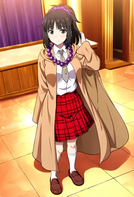 標準的なダンガンロンパアナザー衣装:「美香子は背が高く、スリムな体型の若い女性。肌は淡い色で、黒い目、乱れた黒髪を紫のビーズ付きスクランチでポニーテールにまとめている。目の下にはクマがあり、疲れた表情をしている。彼女はホープズピークの制服を着ており、白い短袖シャツ(サイドポケット付き)、短い薄灰色のネクタイ、赤のチェックスカート、白いミッドカーフソックス、濃いオレンジ~茶色のローファーを履いている。上着には灰色がかった茶色のマントを羽織っている。金色の十字架のネックレスと大きな紫色の念珠をネックレスとして着用している。」
