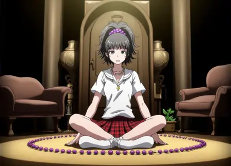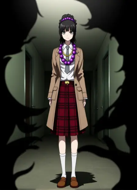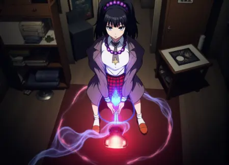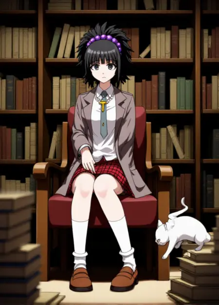 전문가 스타일: "마카코 쿠로카와는 긴 흰색 실험복에 짙은 회색 넥타이를 착용하고 있습니다. 빨간 스커트를 입고 있으며, 안경을 쓰고 있습니다. 흐트러진 검은 머리는 자주색 구슬 헤어밴드로 포니테일로 묶어져 있습니다. 가슴이 큽니다. 흰색 실험복 아래에 검은 베스트를 입고 있습니다."