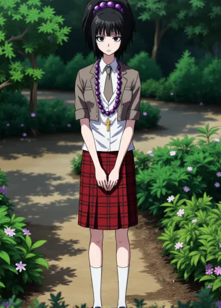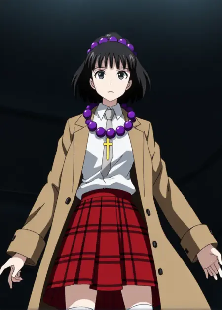 대안 다간론파 어나더 복장 (코트가 마음에 들지 않으면 이 옵션을 사용하세요. 오류 섹션에서 더 자세히 설명합니다): "마카코 쿠로카와는 키가 크고 날씬한 젊은 여자입니다. 창백한 피부, 검은 눈, 흐트러진 검은 머리를 자주색 구슬 헤어밴드로 묶은 포니테일을 가지고 있습니다. 눈 아래에는 어두운 달팽이가 있으며, 피곤한 표정입니다. 마카코는 흰색 짧은 소매 드레스 셔츠(측면 주머니 포함), 밝은 회색 짧은 넥타이, 빨간 플레드 스커트, 흰색 종아리 길이 양말, 진한 오렌지-갈색 로퍼로 구성된 희망의 봉우리 교복을 입고 있습니다. 그 위에 회색 갈색 망토를 입고 있으며, 금색 십자형 목걸이와 큰 자주색 기도 구슬 목걸이를 착용하고 있습니다."