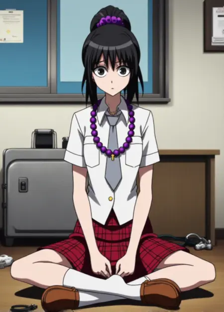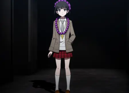 「黒川美香子は背が高く、スリムな体型の若い女性。肌は薄く白く、黒い瞳、乱れた黒髪を鮮やかな紫色のビーズ付きスクランチでポニーテールにまとめている。目の下にはクマがあり、疲れた表情。彼女は希望の峰学園の制服を着用しており、白いショートスリーブのシャツ(サイドポケット付き)、短めの薄灰のネクタイ、赤いチェックのスカート、白いミッドカーフソックス、濃いオレンジ〜茶色のローファーを履いている。上には薄茶色のロングクローケを羽織っている。金色のクロスネックレスと大きな紫色の念珠をネックレスとして着用している。」