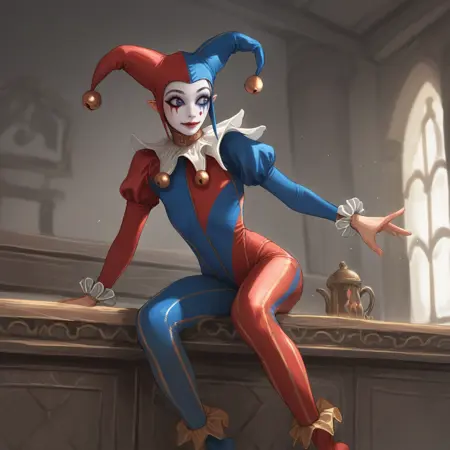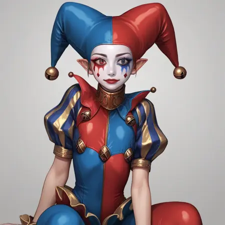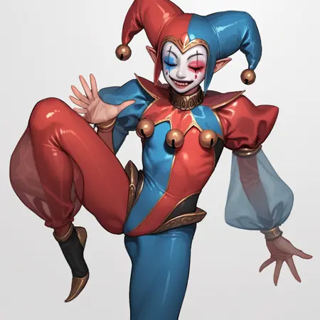 jester cap, puffy sleeves, bodysuit, pointy footwear, facepaint