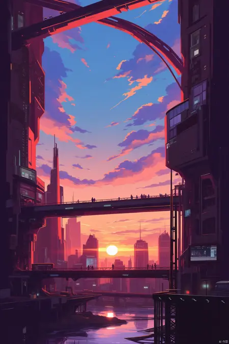 Recommended Tip Words: the eye-level view reveals a vibrant orange and pink sunset over a cityscape. The view is taken from a low-angle vantage point, revealing the cityscape below. The view is taken from a low-angle vantage point, revealing the cityscape below. In the foreground, a bridge stretches across a body of water, adding a touch of depth to the scene. The bridge is adorned with a large, curved arch, adding depth and dimension to the composition.