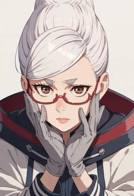 Trigger Words: ayase seiko, white hair, glasses, red-framed eyewear, semi-rimless eyewear, under-rim eyewear, brown eyes