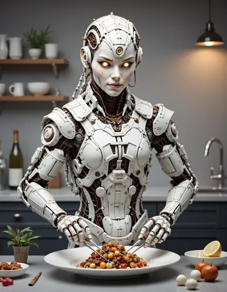Fluxはサイボーグやヒューマノイド(または動物型)ロボットの見た目を理解していますが、それらは通常滑らかで特徴が乏しい傾向があります。このLoRAはその概念を教えることを目的としているのではなく、むしろそれを改善することを意図しています。動きのあるプレートや電子部品を追加することで、よりエキサイティングでSF的な外観を実現します。