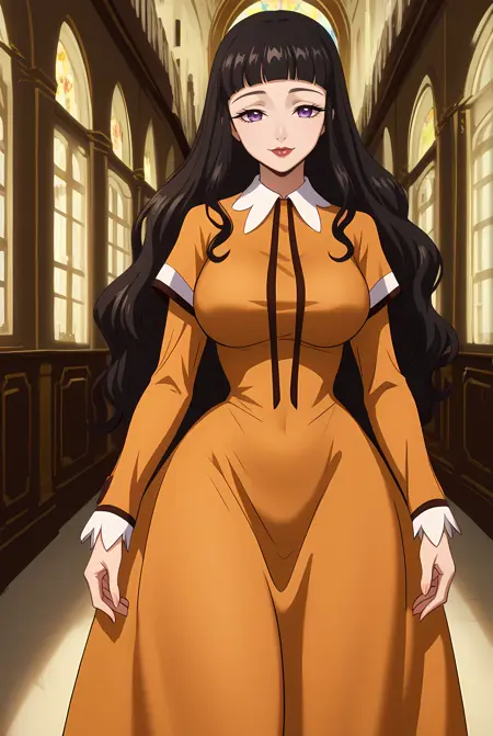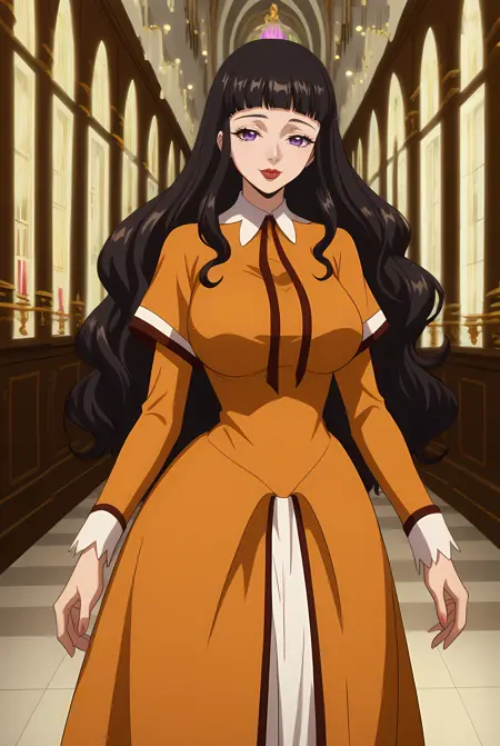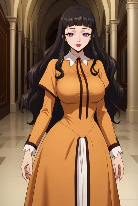 long hair, wavy hair, black hair, blunt bangs, purple eyes, muted brown dress, long sleeves