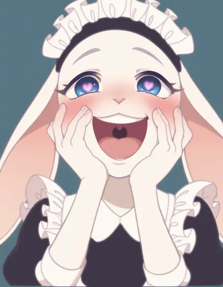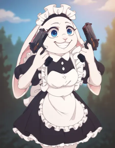 Reiko, hare, blue eyes, white fur, maid uniform, floppy ears.