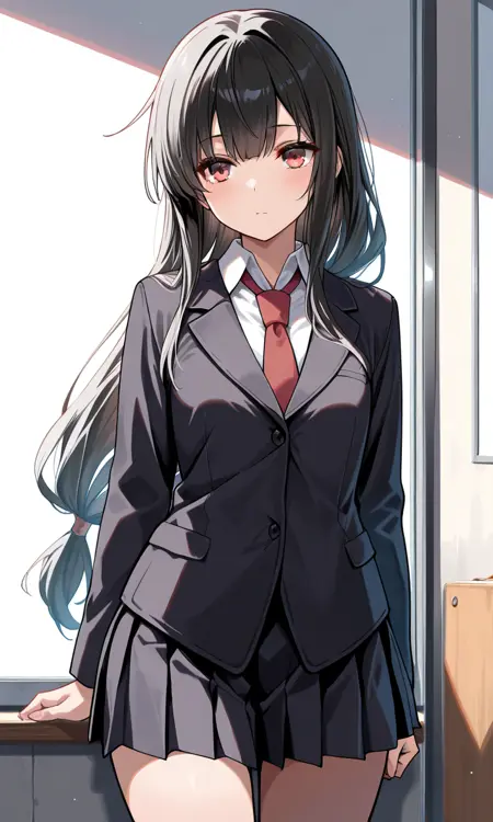 改型服装: hatsushimokaiKC,长发,裙子,衬衫,红眼,长袖,校服,夹克,白衬衫,百褶裙,领带,有领衬衫,黑裙,西装外套,红色领带,低扎长发