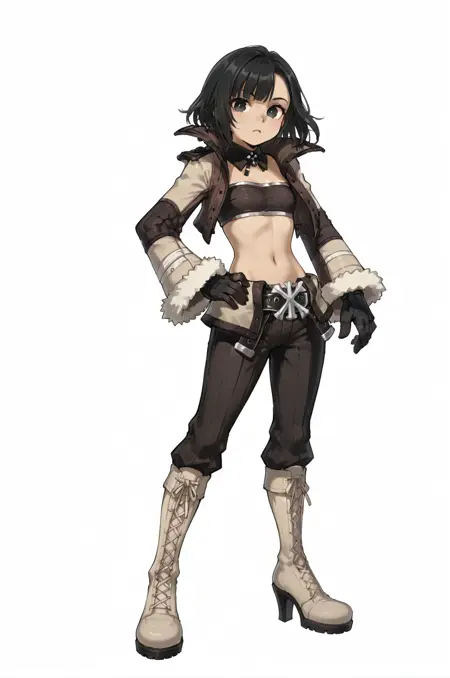 提示词:gunsRo,肚脐,露脐,短款夹克,毛皮镶边,腰带,敞开式服装,长袖,黑色束胸,短上衣,手套,黑色蓬松长裤,腰带扣,及膝靴,交叉系带鞋履,高跟鞋