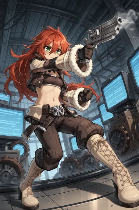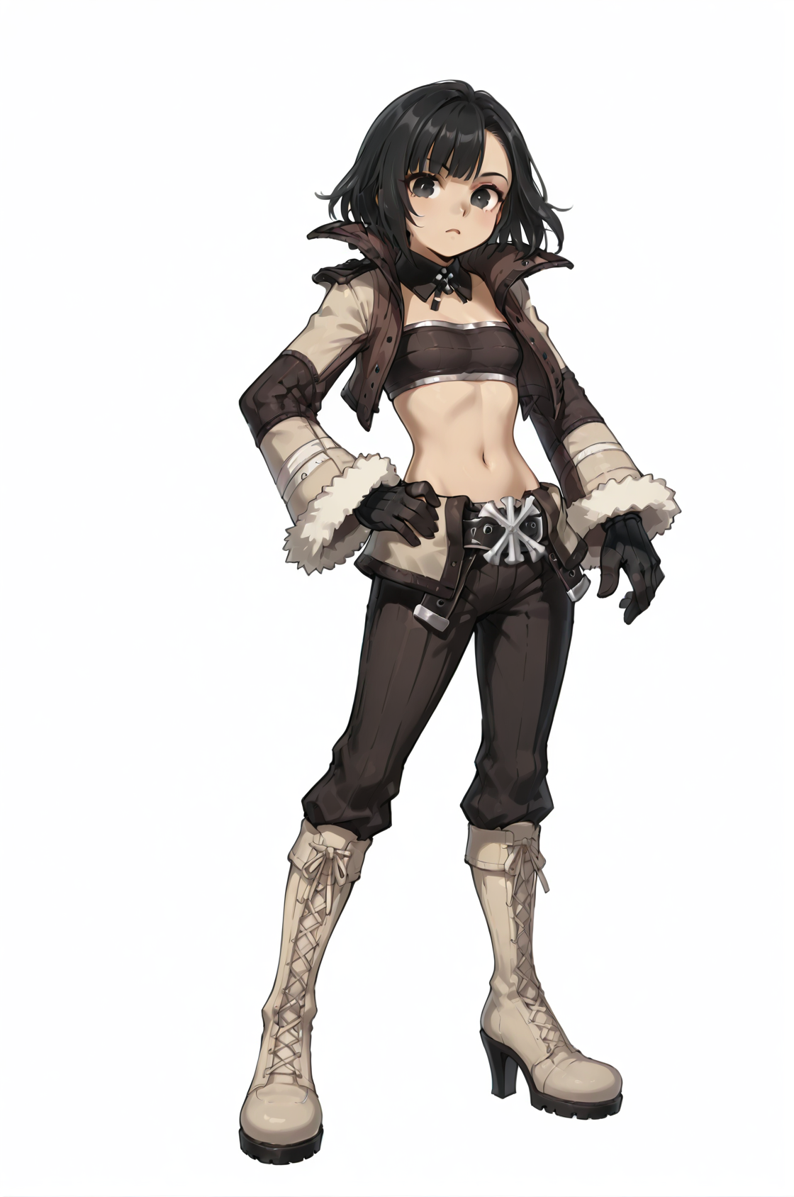 提示词:gunsRo,肚脐,腰腹,短款夹克,毛皮镶边,腰带,露肤服装,长袖,黑色束胸,短上衣,手套,黑色长裤,腰带扣,过膝靴,交叉系带鞋,高跟鞋