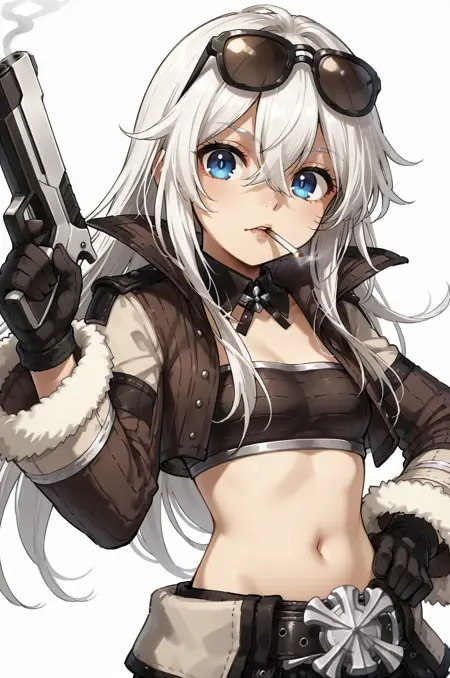 提示词:gunsRo,肚脐,腰腹,短款夹克,毛皮镶边,腰带,露肤服装,长袖,黑色束胸,短上衣,手套,黑色蓬松长裤,腰带扣,过膝靴,交叉系带鞋,高跟鞋