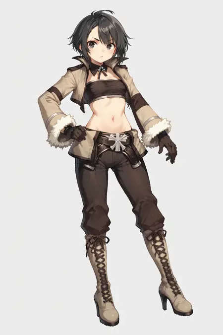 프롬프트: gunsRo, 배꼽, 허리, 커팅 재킷, 모피 트림, 벨트, 오픈 의상, 긴 소매, 블랙 바น도, 크롭탑, 장갑, 블랙 팬츠, 벨트 버클, 무릎 부츠, 십자 끈 신발, 하이힐