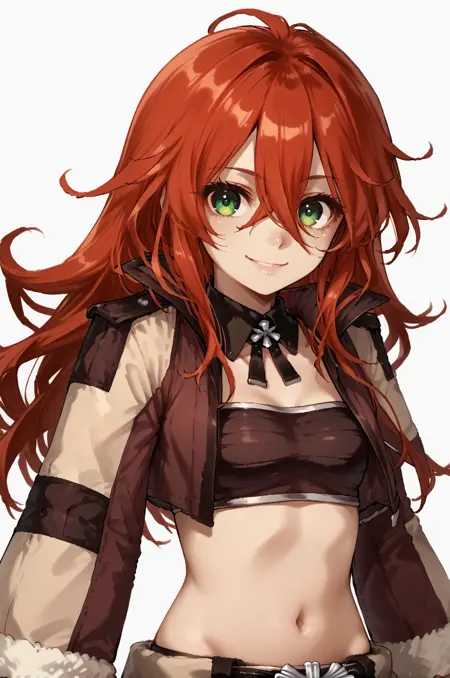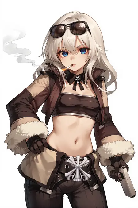 프롬프트: gunsRo, 배꼽, 허리, 커팅 재킷, 모피 트림 소매, 벨트, 오픈 의상, 긴 소매, 블랙 바น도, 크롭탑, 장갑, 블랙 팬츠, 벨트 버클, 분리형 칼라, 무릎 부츠, 십자 끈 신발, 하이힐