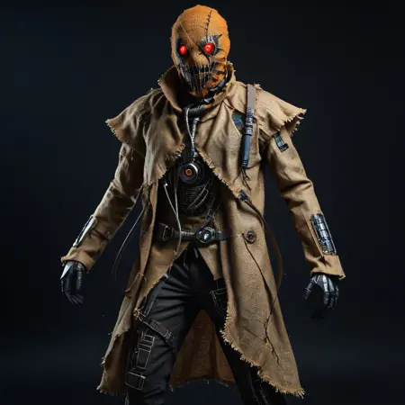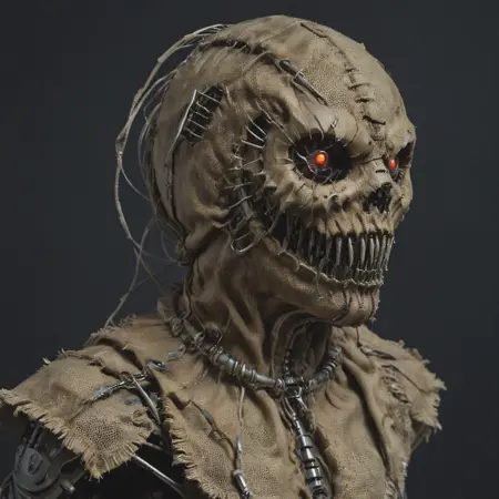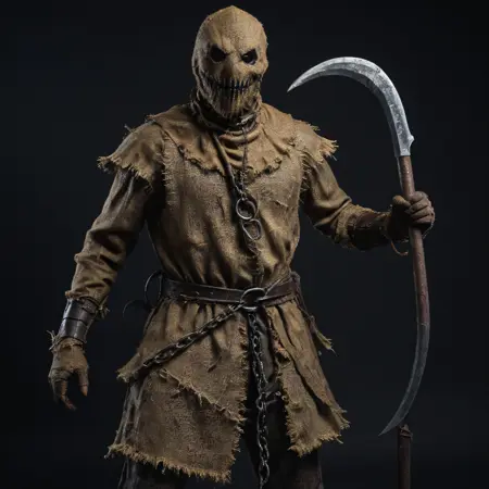 예시: 끔찍하고 매우 세부적인 중세 처형자 농부의 흉내 내기 인형 캐릭터. 이 인형은 키가 크고 위협적으로 서 있으며, 머리는 불균형한 바늘땀과 비틀어진 괴상한 웃음이 있는 찢어진 **황마천 봉투 마스크**로 덮여 있다. -- 이런 식이 가장 효과적입니다.
