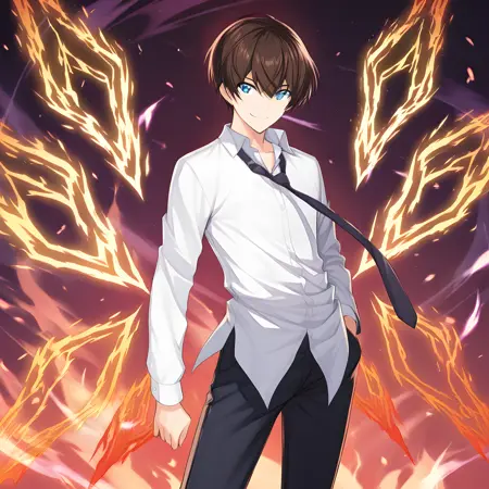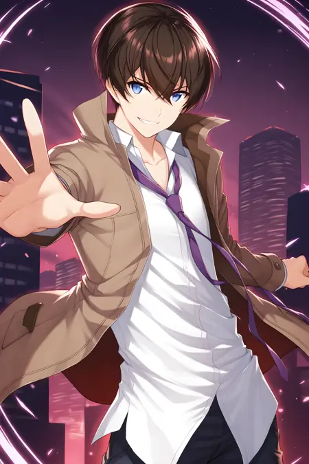 服装标签1为:“1boy, short hair, necktie, school uniform, pants, shirt, jacket, purple necktie, white shirt, black pants, black footwear, open clothes, shoes”。还有额外变体:“black glass”。