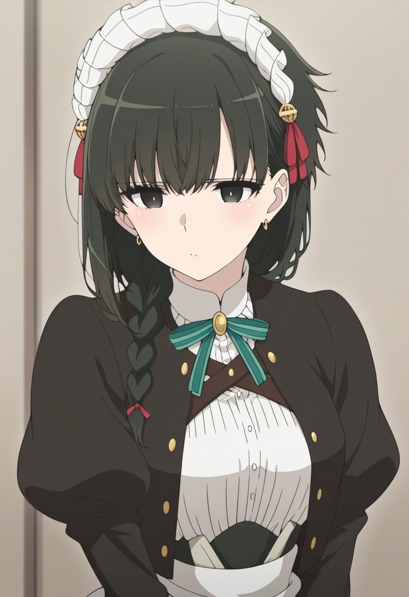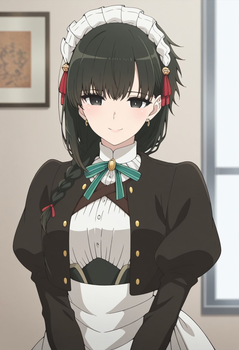yokoya, 1girl, solo, black eyes, black hair, braid, hair over shoulder, maid headress, jewelry, earrings, maid, shirt, white shirt, ribbon, neck ribbon, jacket, black jacket, long sleeves, gloves, white gloves, skirt, black shirt, apron, white apron, maid apron, boots, black footwear,