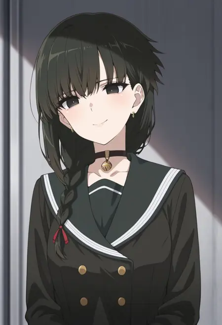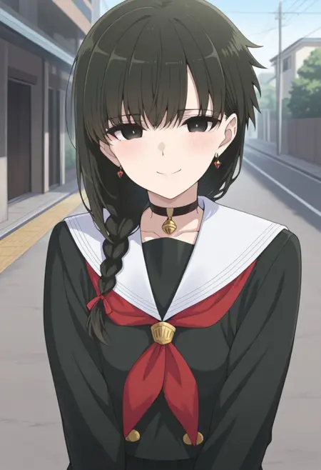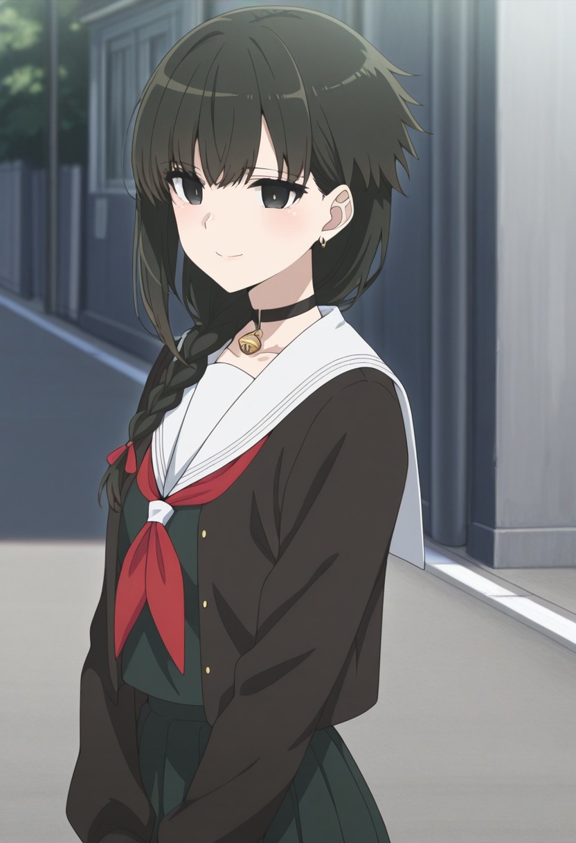 yokoya, 1girl, solo, black eyes, black hair, braid, hair over shoulder, chocker, black chocker, bell, jewelry, earrings, school uniform, serafuku, jacket, black jacket, long sleeves, skirt, black skirt, pantyhose, black pantyhose, shoes, black footwear,