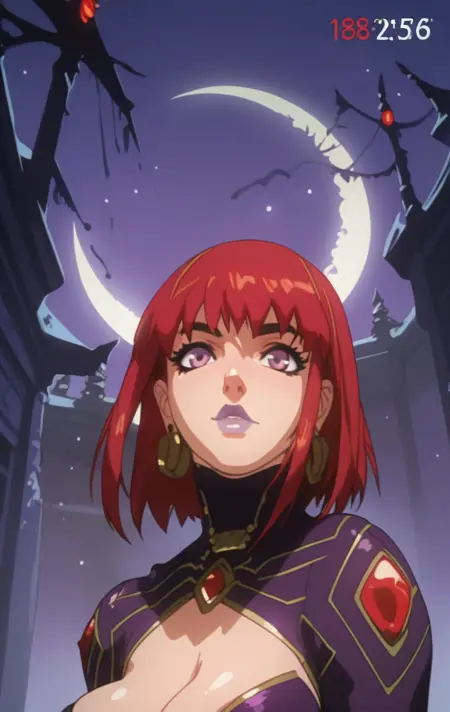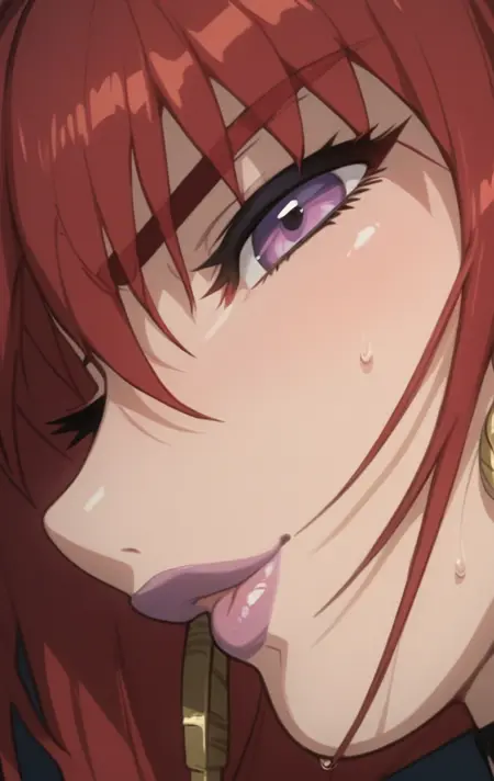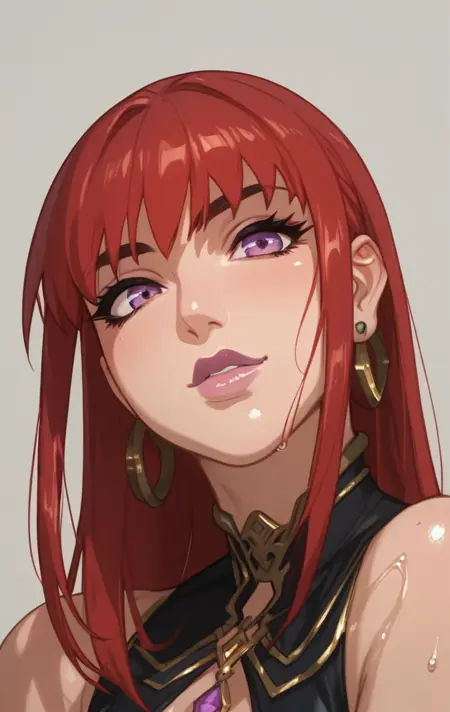 a0n0b0, 1girl, solo, breasts, short hair, large breasts, cleavage, jewelry, purple eyes, red hair, earrings, makeup, lipstick, purple lips,