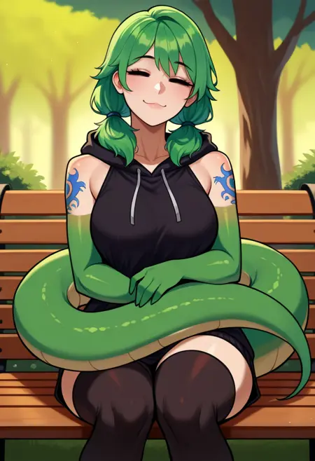 Helping Prompts (Depending on the checkpoint): low twintails, short hair + perhaps dark green hair instead of green hair.