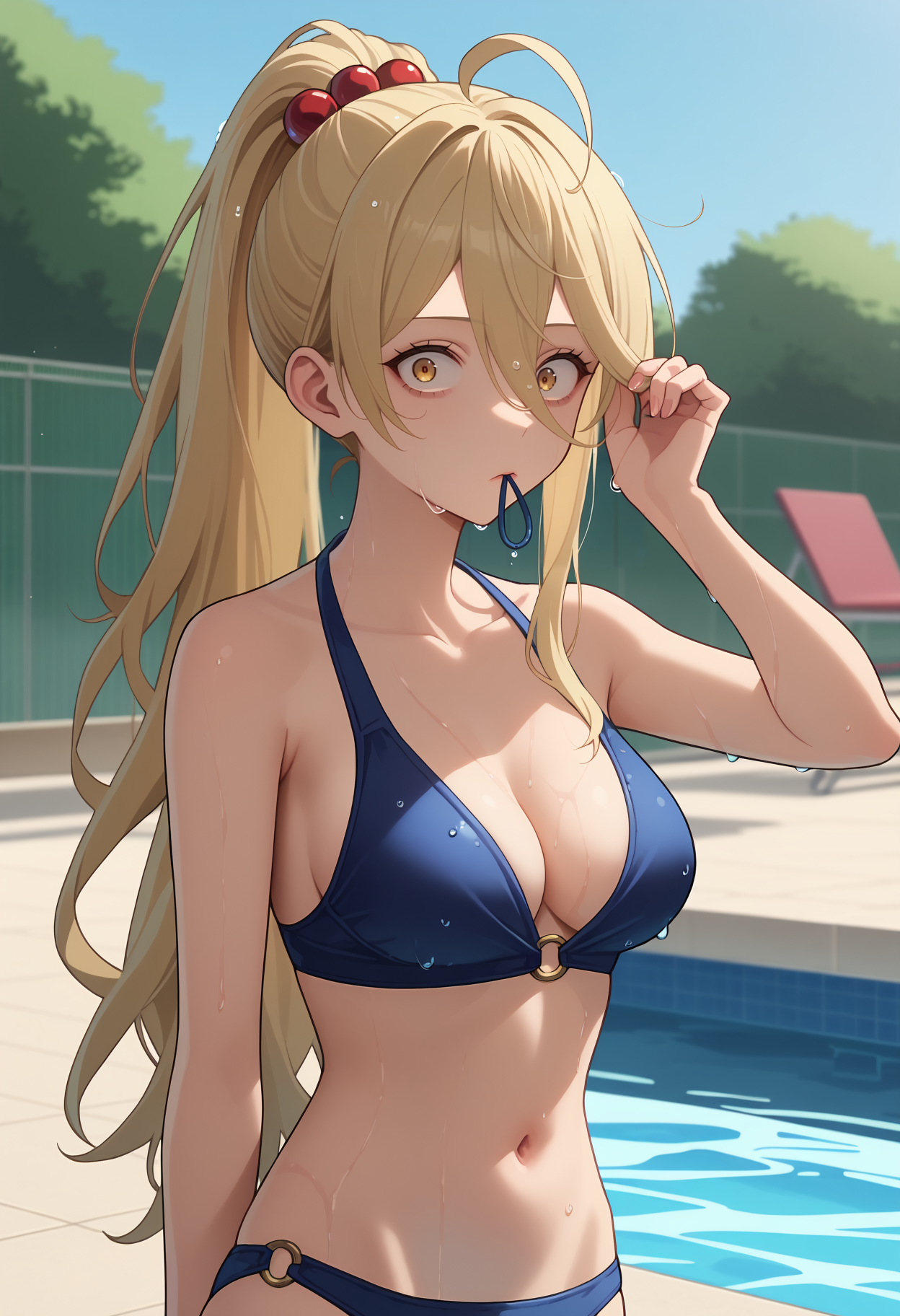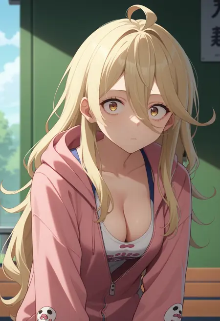 KJOyumeko, blonde hair, yellow eyes, constricted pupils, hair between eyes, ahoge, long hair,