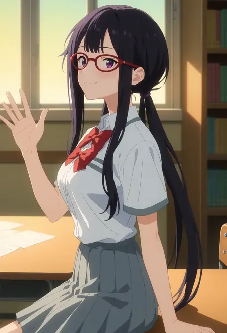 KJOkoto, 黒髪, 紫色の目, 長髪, 低めのツインテール, 赤いメガネ,