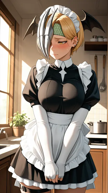 短发,金发,黄眼睛,半面罩,遮住一只眼睛的面罩,头部翅膀,蝙蝠翅膀,耳环,绿色头带,红色连衣裙,中式长裙,白手套,长手套,露指手套,黑色腿套