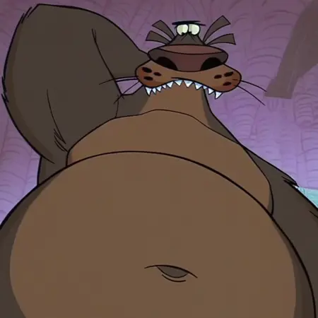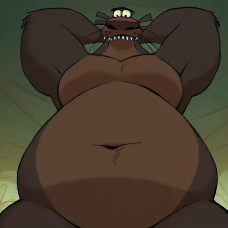 태그: 버리 베어, 갈색 털, 연한 갈색 배 털, 큰 팔, 짧은 다리, 작은 발바닥, 발톱, 날카로운 이빨, 긴 코, 갈색 코, 큰 코부리, 수염, 주근깨, 작은 눈, 단일 눈썹, 모브스, 큰 배, 배꼽, 작은 꼬리, 혼자