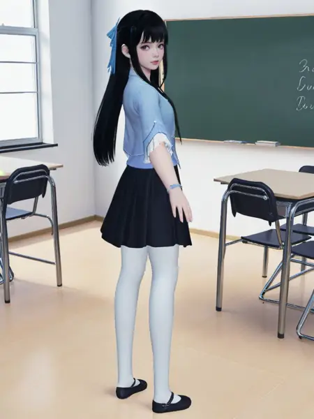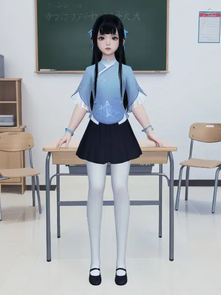 正面:loli, solo, lora:[衣服]-[莫等闲-天刀少女]tdsvmdx_v2[LyCORIS]:0.65, tdsvmdx, early teen, petite, 黒髪, 長髪, 髪飾り, 青い中国風シャツ, 平らな胸, ブレスレット, 黒いプリーツスカート, (白い丈長靴下:1.2), 黒いローファー,