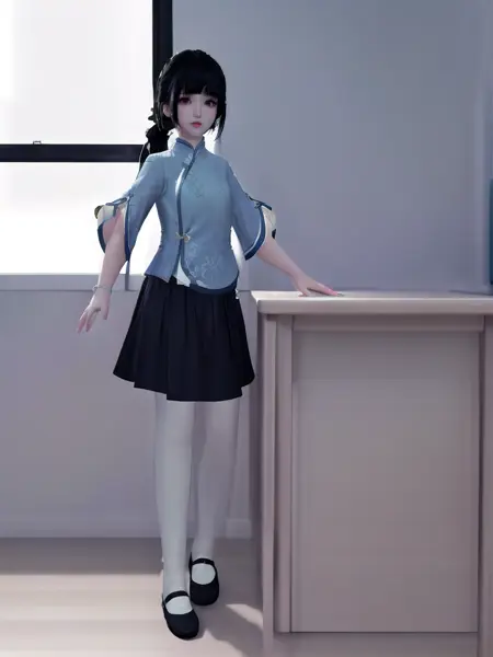 正面:loli, solo, lora:[衣服]-[莫等闲-天刀少女]tdsvmdx_v2[LyCORIS]:0.65, tdsvmdx, early teen, petite, 黒髪, 長髪, 髪飾り, 青い中国風シャツ, 平らな胸, ブレスレット, 黒いプリーツスカート, (白い丈長靴下:1.2), 黒いローファー,